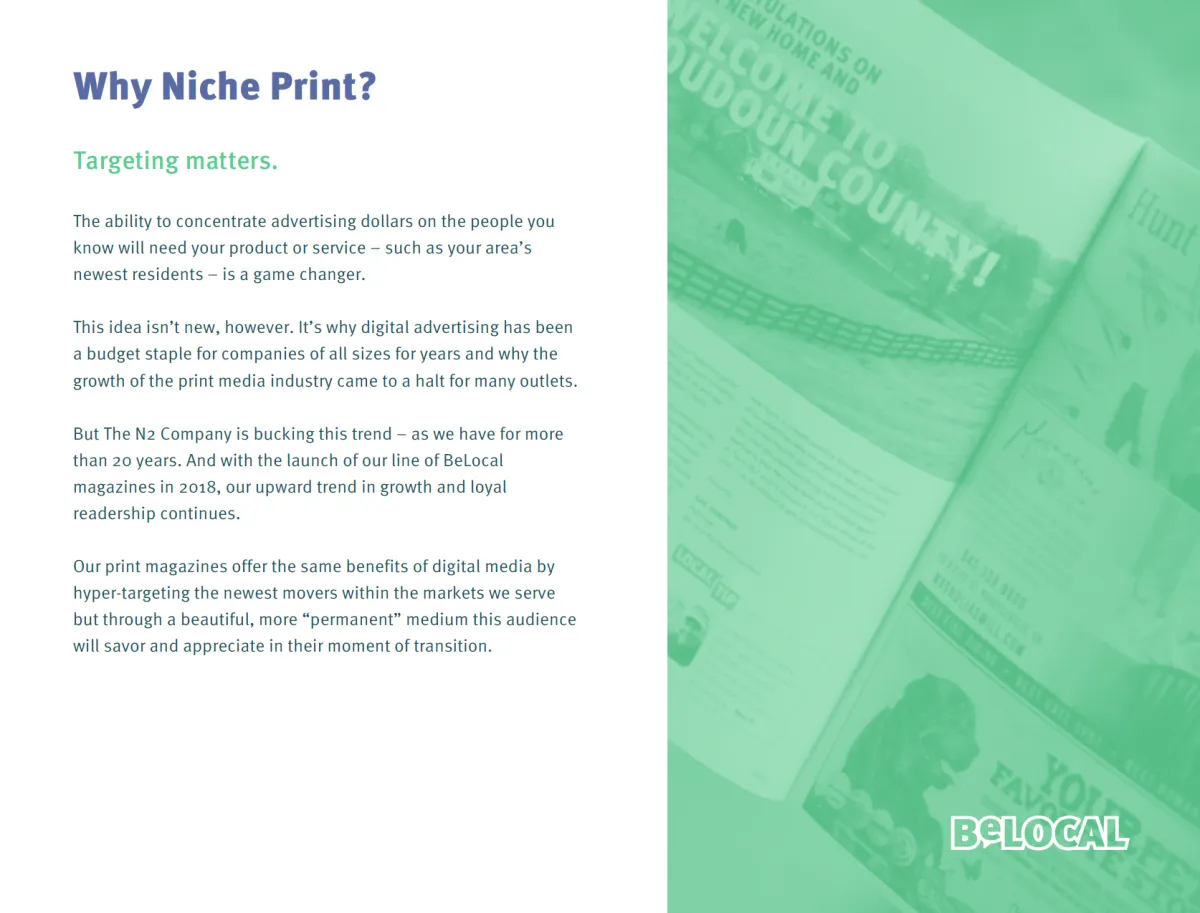 Although it takes time for people to trust and choose a business, Belocal begins at the top of the funnel and provides multiple opportunities for a business brand to be conveyed to new and long term local residents in a relational, rather than transactional manner. We do this through a multi-platform strategy that increases accessibility through print, social, and web.